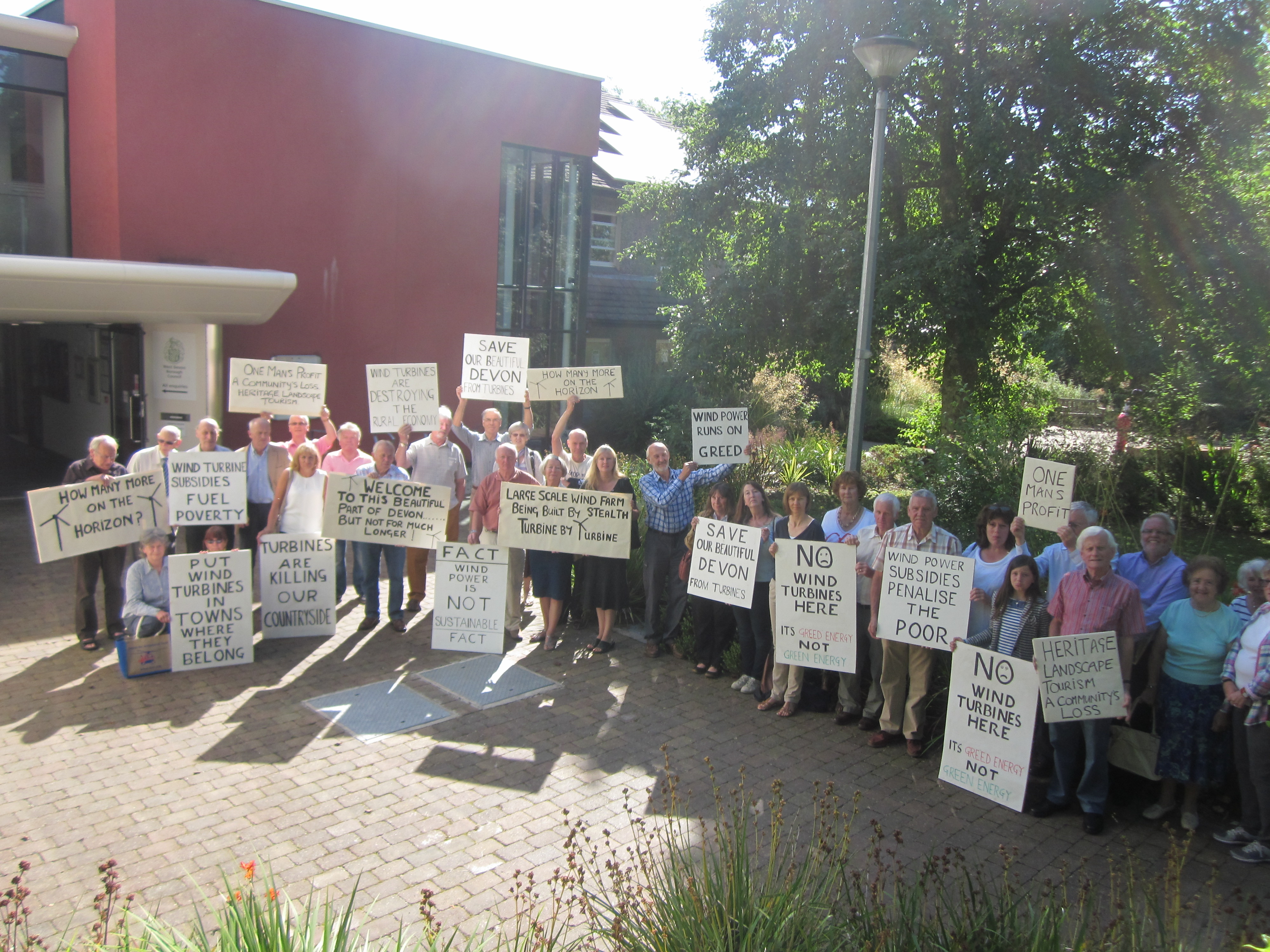77m wind turbine at Heane Farm refused by planning committee today. Local residents from Hatherleigh and surrounds gathered outside the Council offices in Tavistock. 29th July 2014